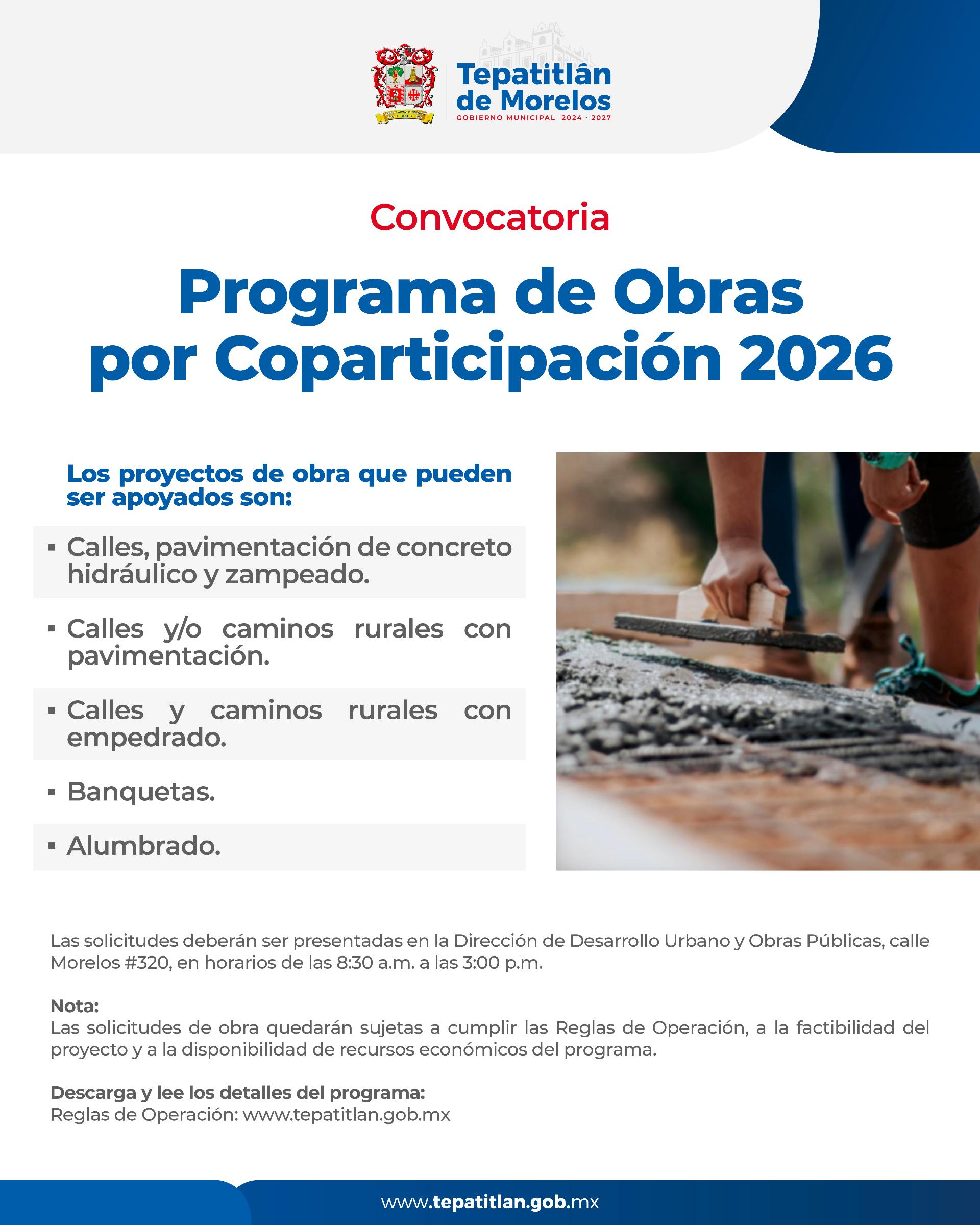 Convocamos a los ciudadanos del Municipio de Tepatitlán de Morelos (Rancherías, Delegaciones, Agencia y Cabecera) a presentar solicitudes de apoyo para el “Programa de Obras por Coparticipación 2026”.